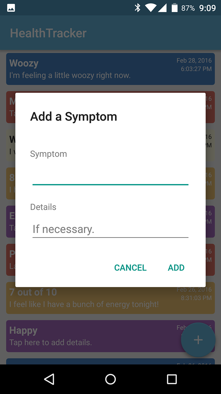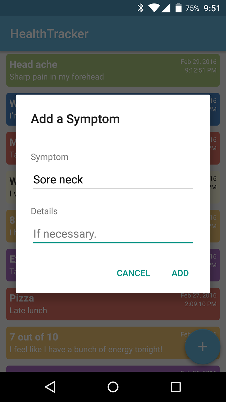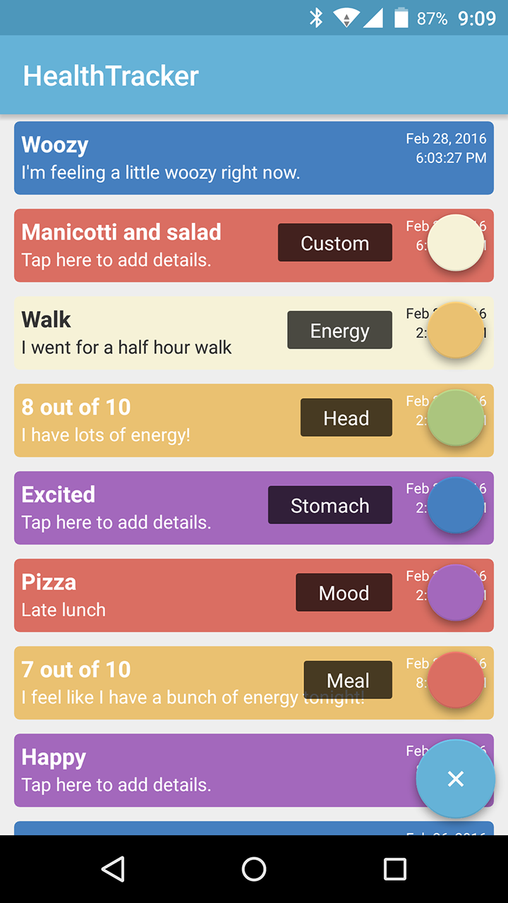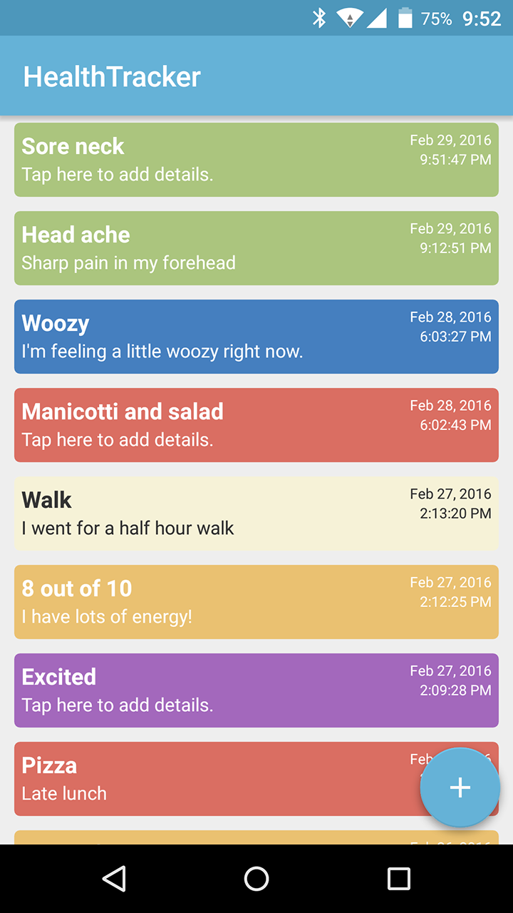 This app lets you track how you are feeling. You can add entries based on type, and enter a description if you want to leave extra information.